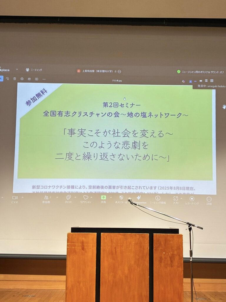 コロナワクチンで息子さんを亡くされた影山氏、科学者で薬害の研究者の上島有加里さん、代表正田さん、全牧代表の井森、森両牧師の講演、コロナワクチンで重度の後遺症をへてクリスチャンになられたよっぴーさんの証。