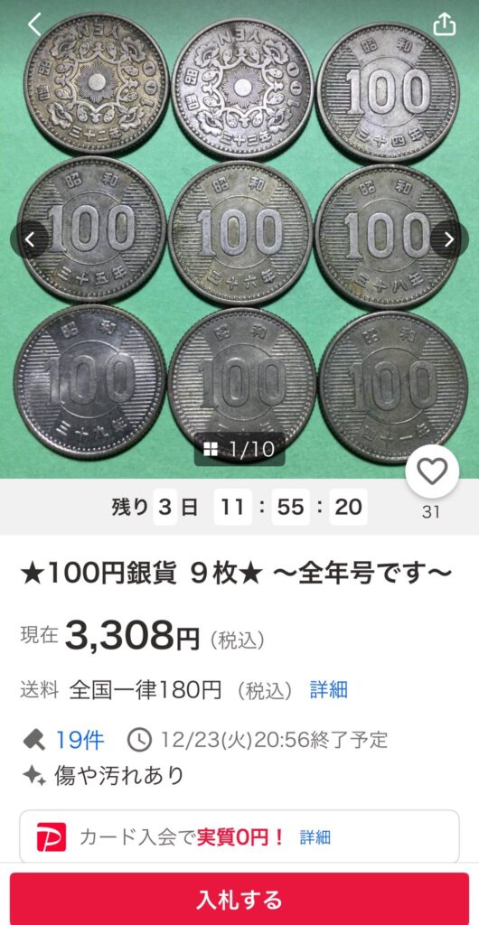 ヤフオクの旧100円玉を見たら、価格が昨年の3倍になっていて驚いた。旧100円硬貨には銀が60%含まれている。